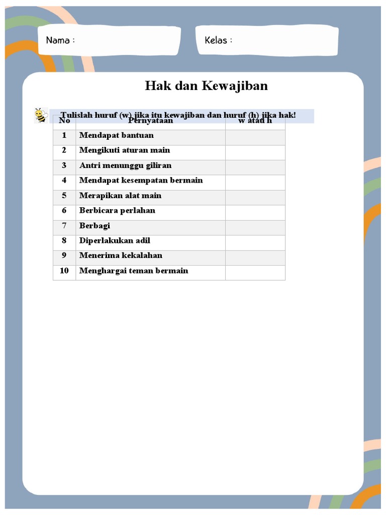 - Kewajiban adalah sesuatu yang harus kita lakukan, yang menjadi tugas atau tanggung jawab kita. Kewajiban biasanya berkaitan dengan menjaga hak orang lain atau menjaga sesuatu yang penting. Contohnya, kewajibanmu adalah belajar dengan rajin, membantu orang tua di rumah, dan menjaga kebersihan.