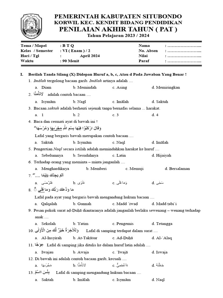 Soal BTQ kelas 3 semester 2 umumnya dapat dikategorikan menjadi beberapa bentuk: